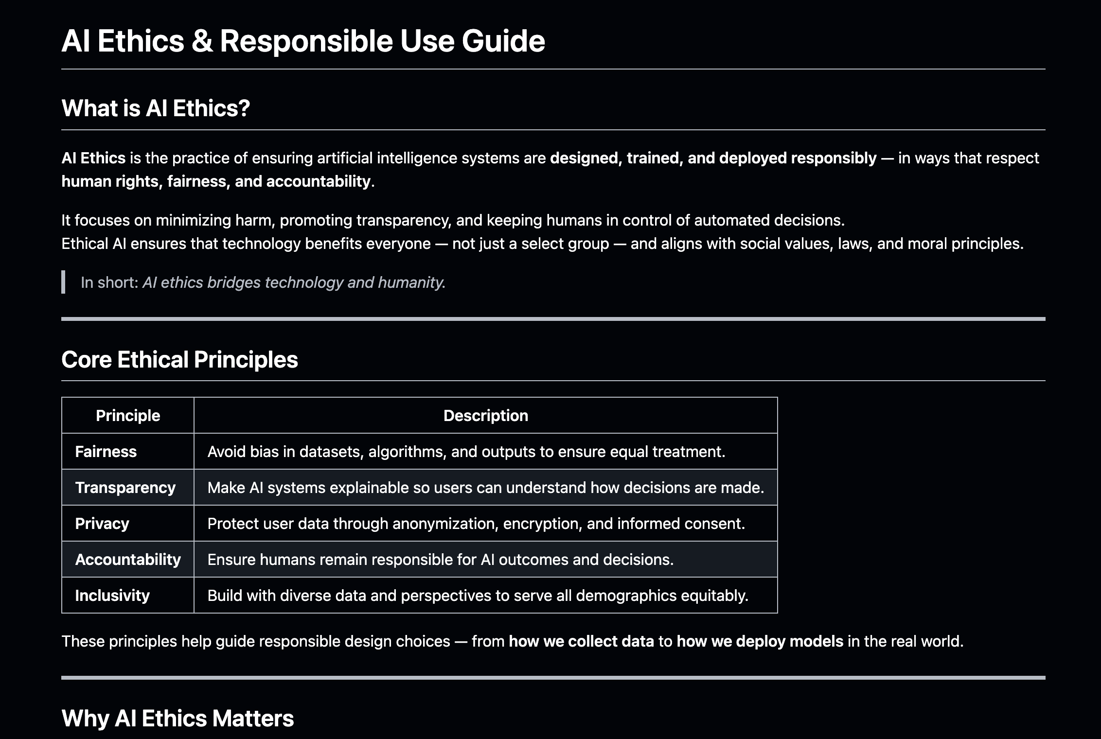 A clear and practical introduction to ethical AI, covering fairness, transparency, privacy, accountability, and inclusivity. This guide explains why responsible AI matters, how to build ethical systems, and the global frameworks shaping the future of trustworthy technology.