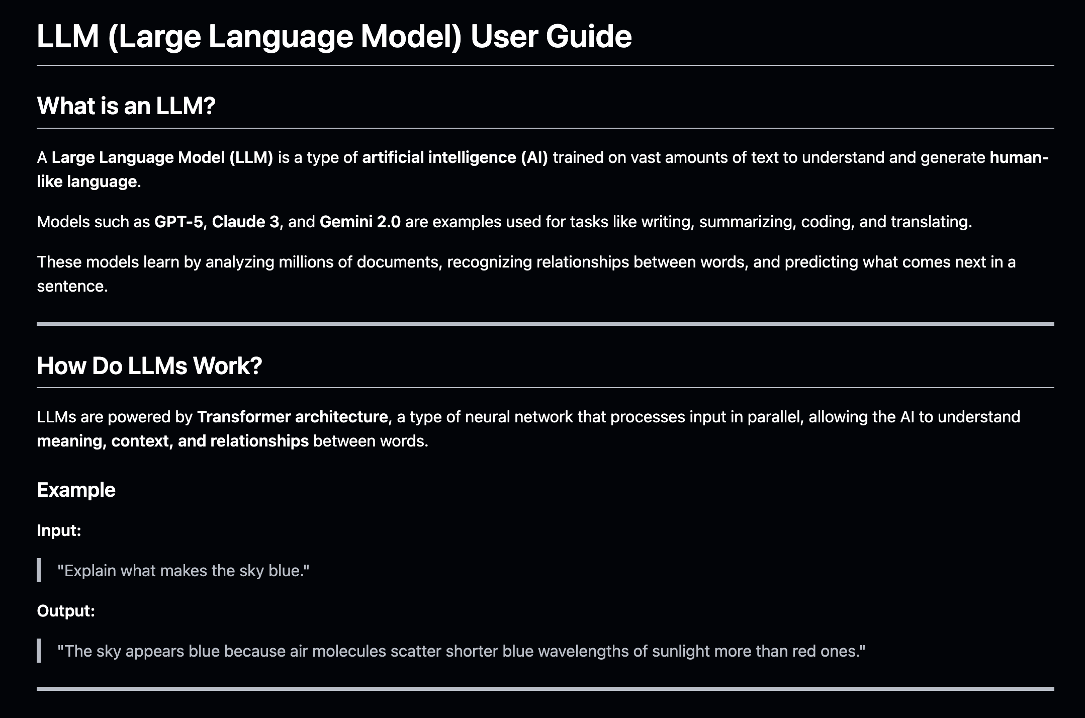 A clear and accessible overview of how large language models like GPT, Claude, and Gemini work, including their architecture, core components, and real-world applications, explained with simple examples and FAQs.